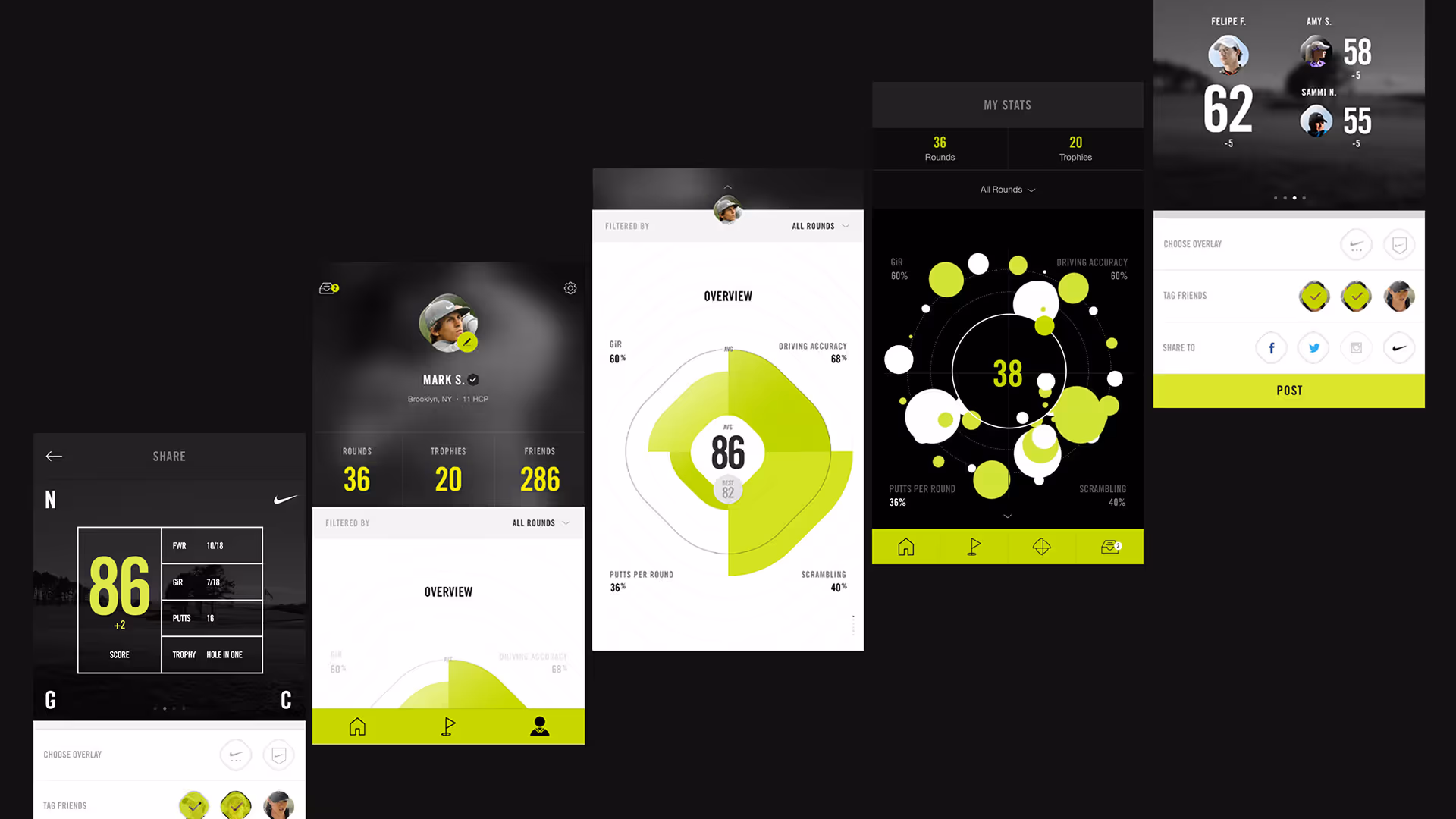 We relaunched the Nike Golf Club app with a fresh design, immersive visuals and custom animations system to elevate the golfing experience, rewarding users with every achievement.